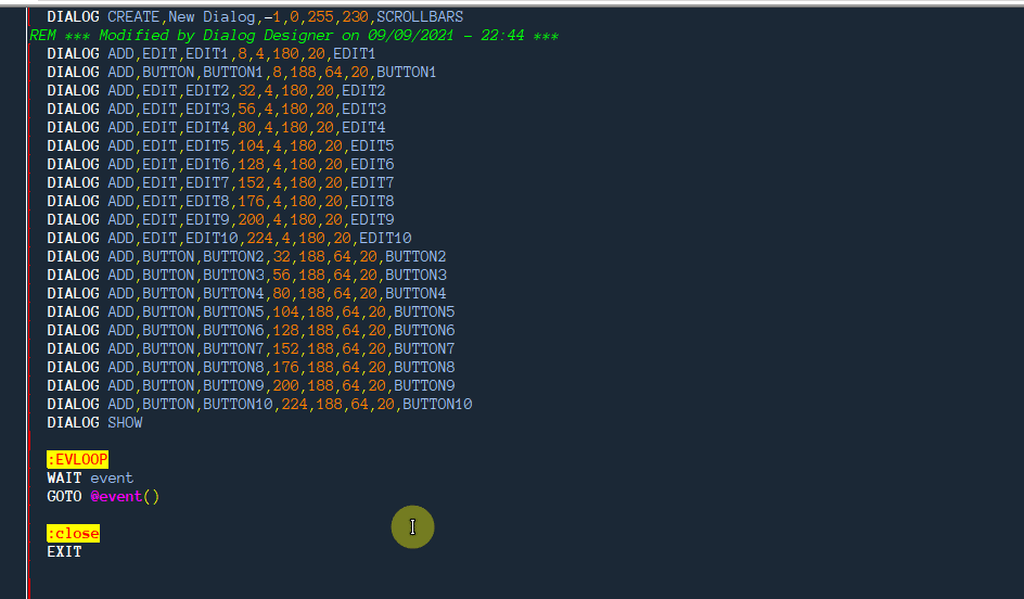 | Code: | | window position,new dialog,@winpos(new dialog,T),@winpos(new dialog,L),800,400 |